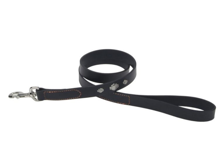 Diese Leine für Hunde Harley-Davidson "Lederperle Black" besteht aus Leder. Die Leine ist mit drei silberfarbenen Bar & Shield -Emblemen dekoriert und verfügt über orange dekorative Nähte. Die Leine hat eine Größe von ca. 04 = 119,5 cm Länge und 1,5 cm Breite. Die Leine hat eine Größe von ca. 104 = 119,5 cm Länge und 2,5 cm Breite.
