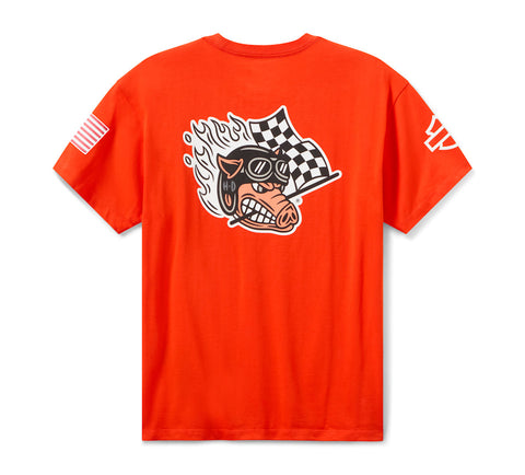 Comfort e stile da gara la fanno da padroni su questa splendida maglietta. Realizzata in jersey di cotone pesante (260 gsm), questa maglietta unisex offre una vestibilità rilassata. Il capo è rifinito con una serie di grafiche che celebra la tradizione di Harley-Davidson nelle corse motociclistiche. Conosci la storia: lo stile arcuato della grafica frontale ricorda il nostro abbigliamento da corsa del 1937. La grafica Fast Johnnie sul dorso rende omaggio al momento in cui il maiale divenne la nostra mascotte ufficiale nel 1920, dopo che uno dei nostri piloti se lo portò dietro nel giro d'onore a Marion, in Indiana.