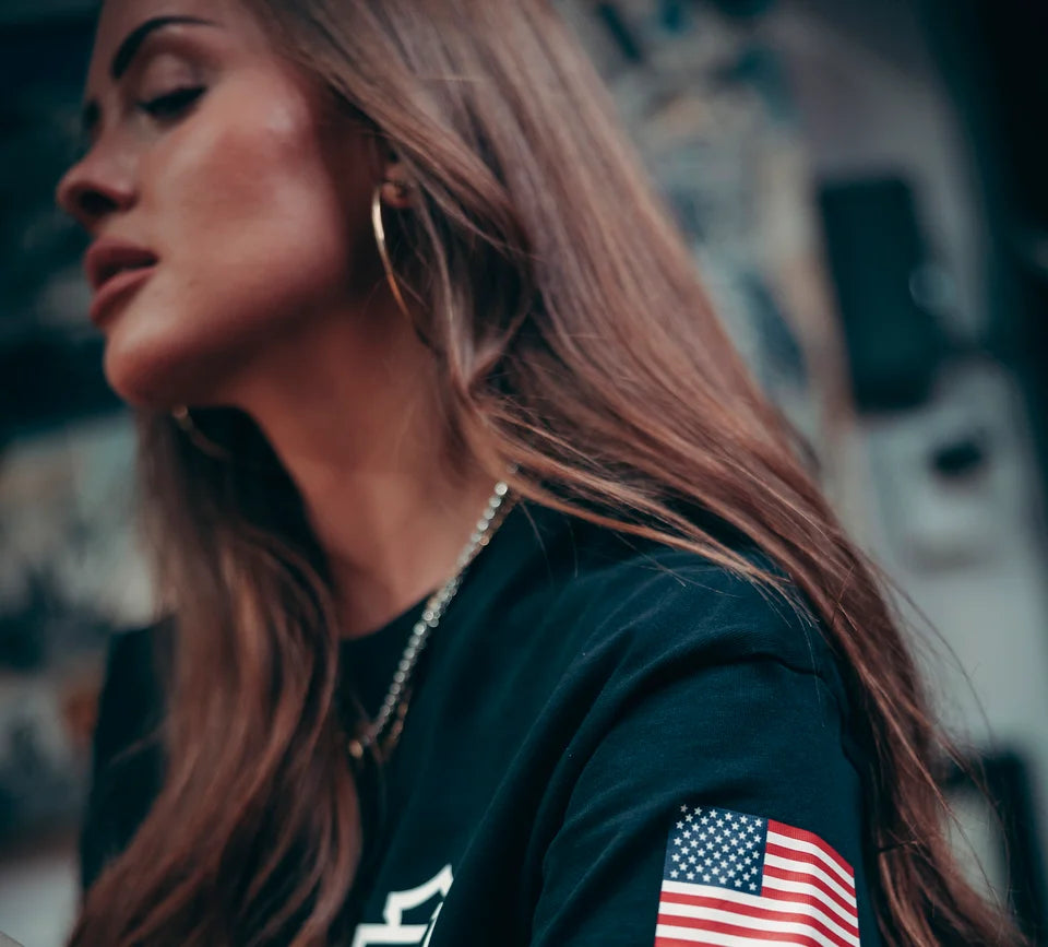 Impresión de mano suave en la parte delantera, espalda y mangas. Etiqueta principal impresa con marcas
